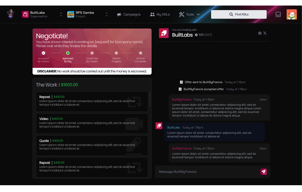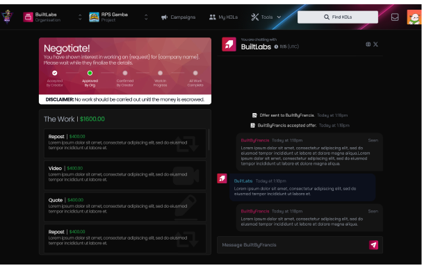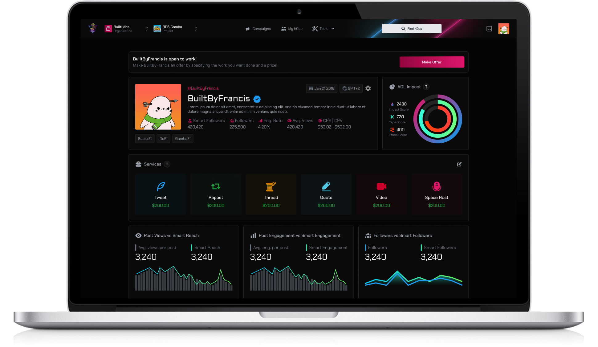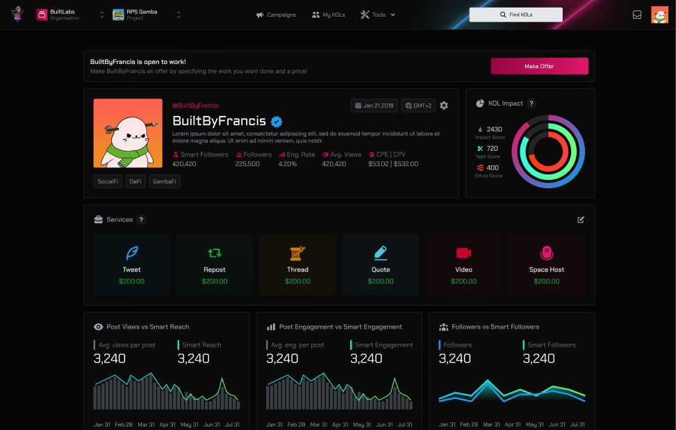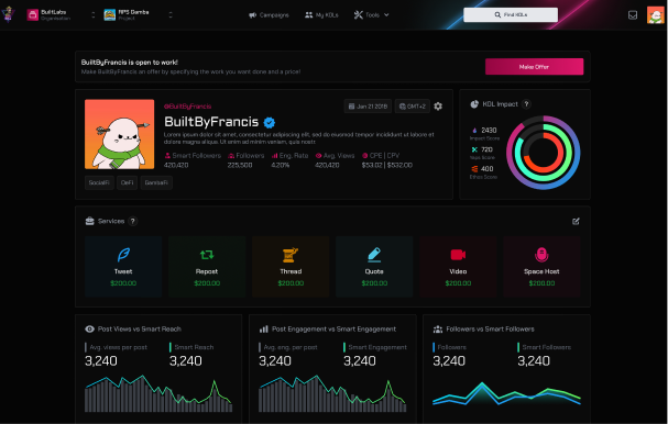 Influencer marketing in Web3 has long been plagued by fake followers, opaque engagement, and informal negotiations over DMs. Brands often lacked the tools to evaluate whether they were paying for real reach, while KOLs had no secure way to structure deals and guarantee payment.