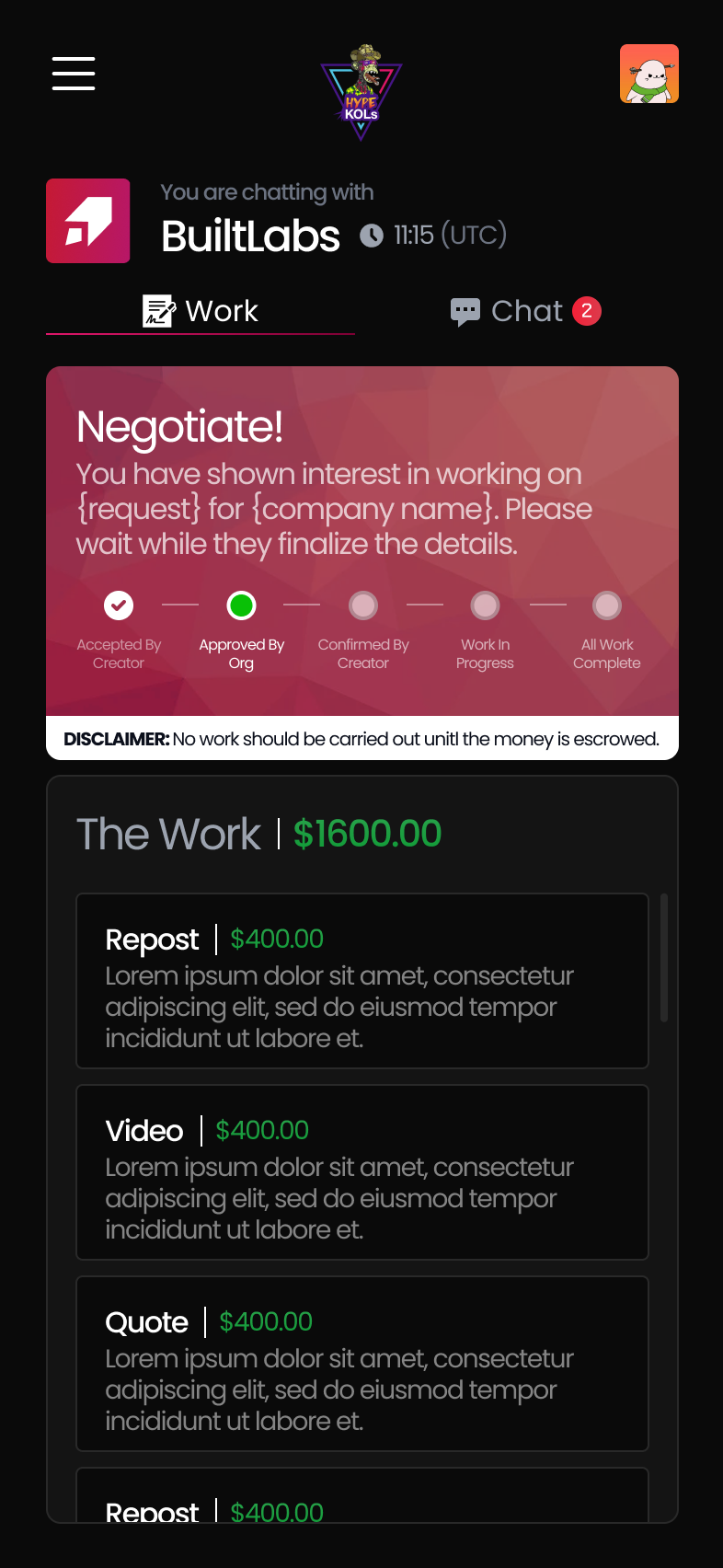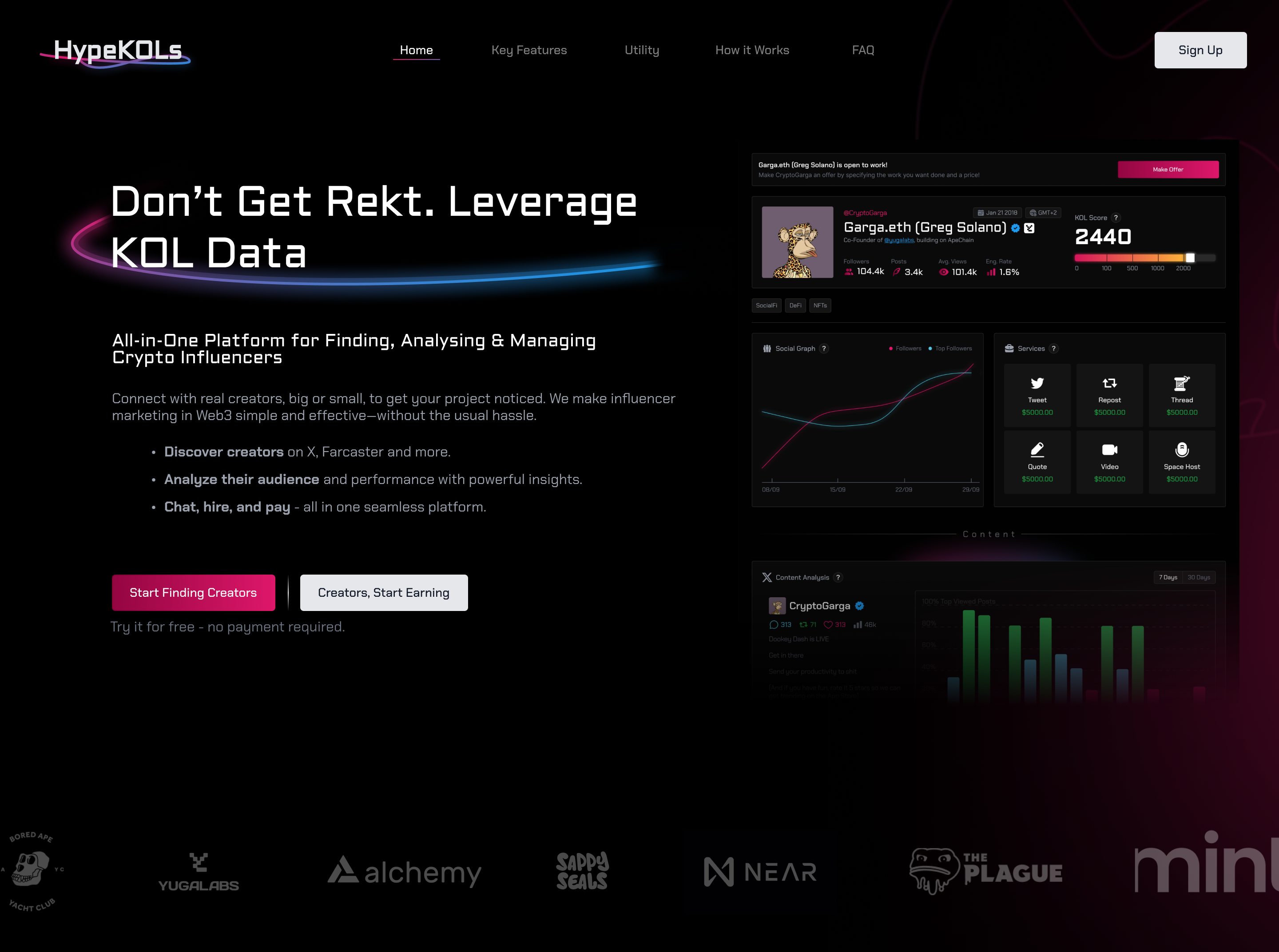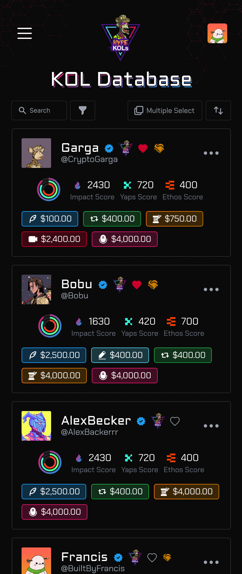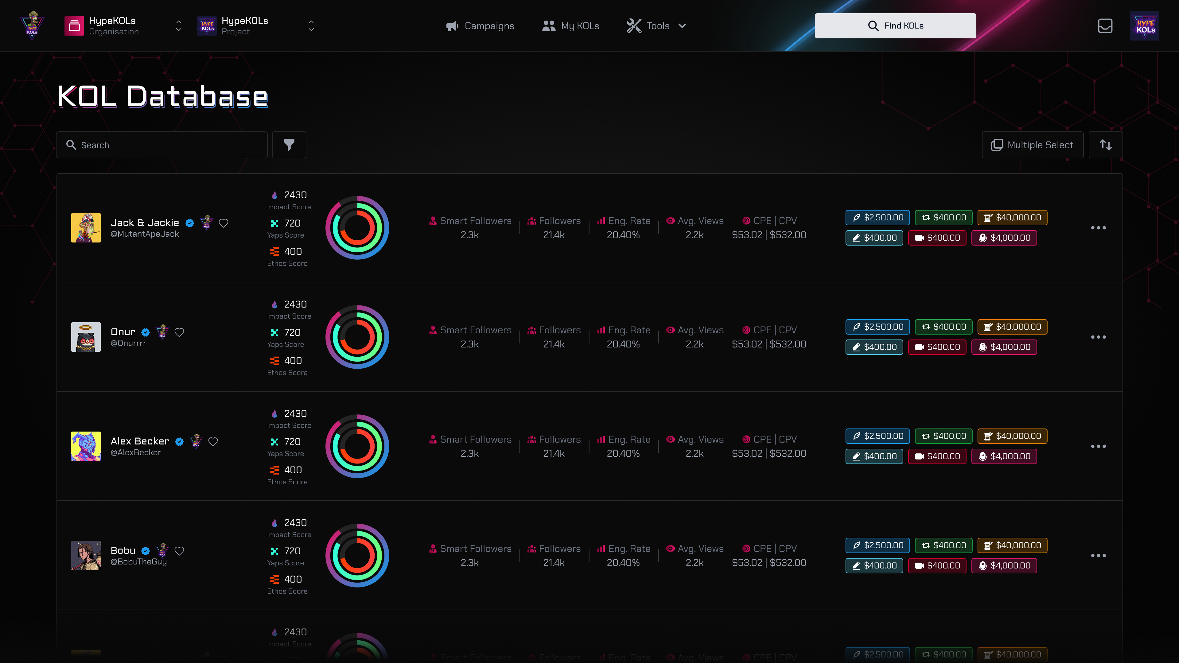 The goal of HypeKOLs was to build a transparent, data-driven marketplace that empowered brands to discover, evaluate, and hire crypto influencers with confidence. I designed the entire product experience — from rich analytics-driven profile pages, to a fully responsive KOL database with powerful dynamic filters, to an escrow-backed job lifecycle that ensured accountability on both sides.